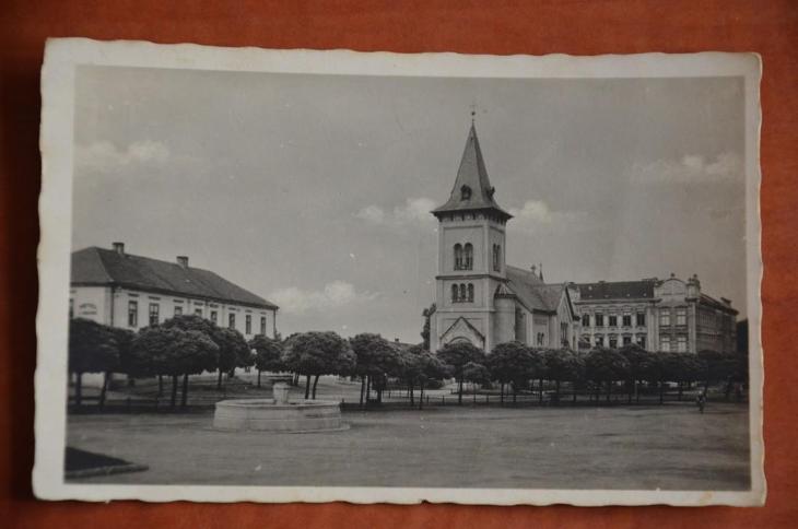 - PEČKY náměstí kostel sv. Václava kašna hotel okres Kolín 1951