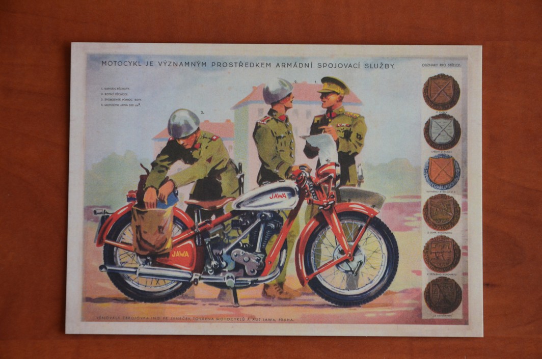 Motocykl JAWA 350 Zbrojovka Ing. Fr. Janeček Praha reklama armádaSkladem10 Kč/ ks