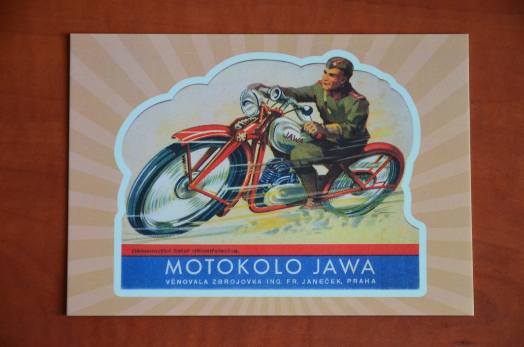 Motokolo JAWA délesloužící četař dělostřelectva ZBROJOVKA Ing. Fr. Janeček Praha reklama armádaSkladem10 Kč/ ks